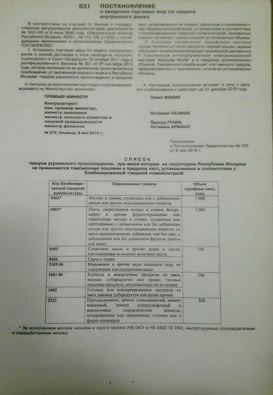 В конце апреля правительство Молдовы ввело защитные квоты и пошлины на животноводческую продукцию и цемент украинского производства.