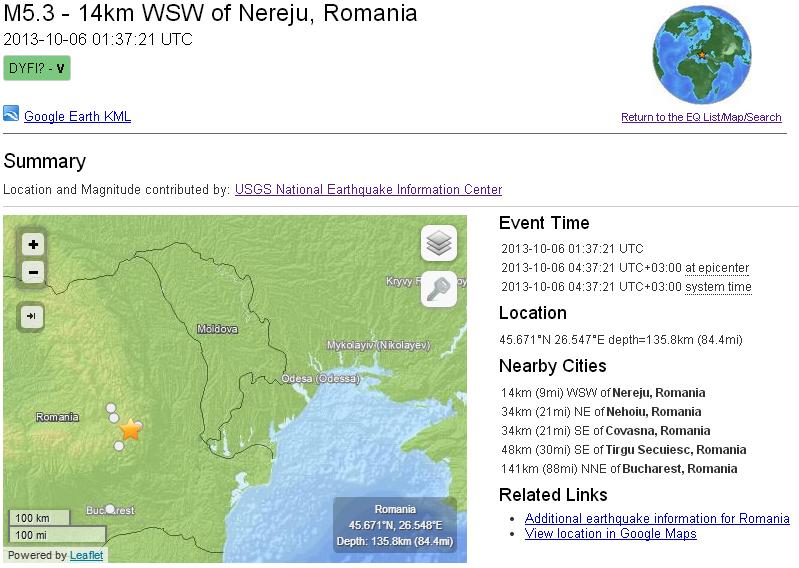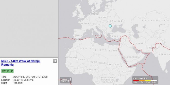 В Румынии произошло землетрясение магнитудой 5,3 по шкале Рихтера. Как сообщает Геологическая служба США, его эпицентр находился в 14 км от г. Нережу.