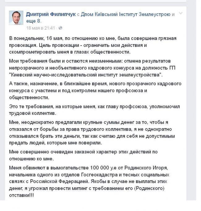 Как сообщалось ранее, глава Всеукраинского профсоюзного объединения «Демократичні профспілки України» и Всеукраинского профсоюза работников отрасли земельных отношений Украины Дмитрии Филипчук требовал 100 тысяч долларов от представителей Государственной службы по вопросам геодезии, картографии и кадастра за то, чтобы не проводить митинг под стенами ведомства.