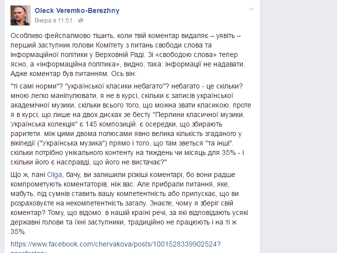 «Особенно фейспалмово радует, когда твой комментарий удаляет - представьте - первый заместитель председателя Комитета по вопросам свободы слова и информационной политики в Верховной Раде. Со «свободой слова» теперь ясно, а «информационная политика», видно, такая: информацию не предоставлять. Что ж, госпожа Ольга, вижу, вы оставили более резкие комментарии, потому что они скорее компрометируют комментаторов, чем вас. Но убрали вопрос, который, видимо, под сомнение ставит вашу компетентность или предполагает, что вы рассчитываете на некомпетентность общественности», - написал Веремко-Бережной.