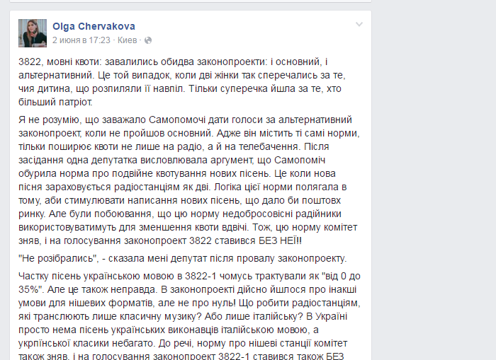 Червакова заявила, что альтернативный законопроект имеет те же нормы, что и основной. «Я не понимаю, что мешало Самопомощи дать голоса за альтернативный законопроект, когда не прошел основной. Ведь он содержит те же нормы ... Доля песен на украинском языке в 3822-1 почему-то трактовали как «от 0 до 35%». Но это тоже неправда. В законопроекте действительно речь шла об иных условиях для нишевых форматов, но не про ноль! Что делать радиостанциям, которые транслируют только классическую музыку? Или только итальянскую? В Украине просто нет песен украинских исполнителей на итальянском языке, а украинской классики немного», - написала Червакова на своей странице в социальной сети.