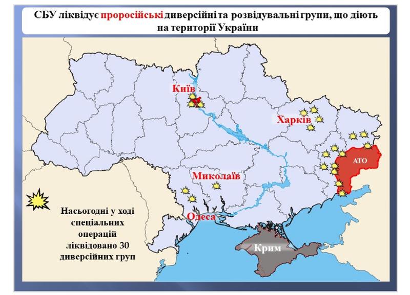 Сотрудники Службы безопасности Украины за последний год ликвидировали 30 диверсионно-разведовательных групп, подготовленных российскими спецслужбами для совершения диверсий не только в районе проведения антитеррористической операции, но и в мирных регионах.