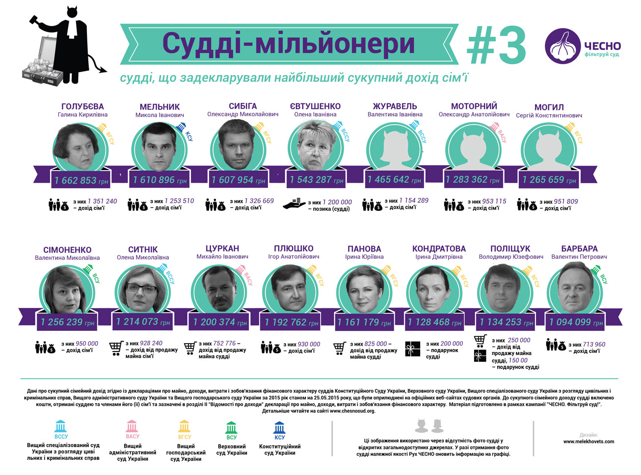 Как отмечается, эксперты движения проанализировали совокупный семейный доход 2015 года судей Конституционного Суда Украины, Верховного Суда Украины, Высшего специализированного суда Украины по рассмотрению гражданских и уголовных дел, Высшего административного суда Украины и Высшего хозяйственного суда Украины.