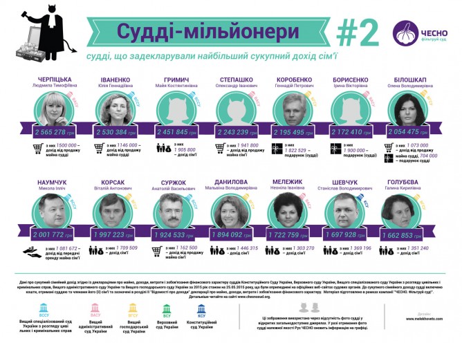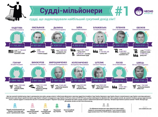 — Елена Кадетова, судья Высшего специализированного суда Украины по рассмотрению гражданских и уголовных дел. Совокупный доход семьи в 2015 году составил 11 765 297 грн. Из этих средств 11 156 622 грн семья судьи получила из США;
