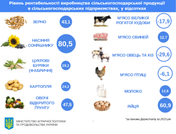 По итогам 2015 года в Украине самым прибыльным видом аграрного бизнеса стало производство семян подсолнечника с показателем рентабельности 80,5%. Второе место по рентабельности заняло производство яиц с показателем 60,9%, а третье — выращивание овощей на открытом грунте — 47,5%.