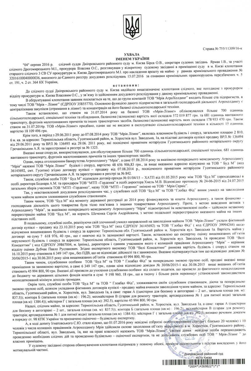 «Вчера следователи прокуратуры г. Киев в сопровождении физической охраны провели обыск на территории АТП Агрохолдинга „Мрия“ в г. Хоростков Тернопольской области и ознакомили представителей компаний „Мрия“ и „ГлобалФид“ с постановлением Днепровского районного суда г. Киев от 4 августа 2016 года. В частности, суд постановил наложить арест на здания и сооружения АТП и передать объект на ответственное хранение ООО „Мрия-Лизинг“, компании, входящий в состав Агрохолдинга „Мрия“. Тарас Дидык, представитель компании „ГлобалФид“, „сотрудники“ которой 1 июля незаконным путем проникли на территорию АТП и по сегодняшний день блокируют доступ на его территорию, отказался подписывать протокол и предоставить сотрудникам „Мрии“ доступ к объекту», — отмечается в заявление пресс-службы.