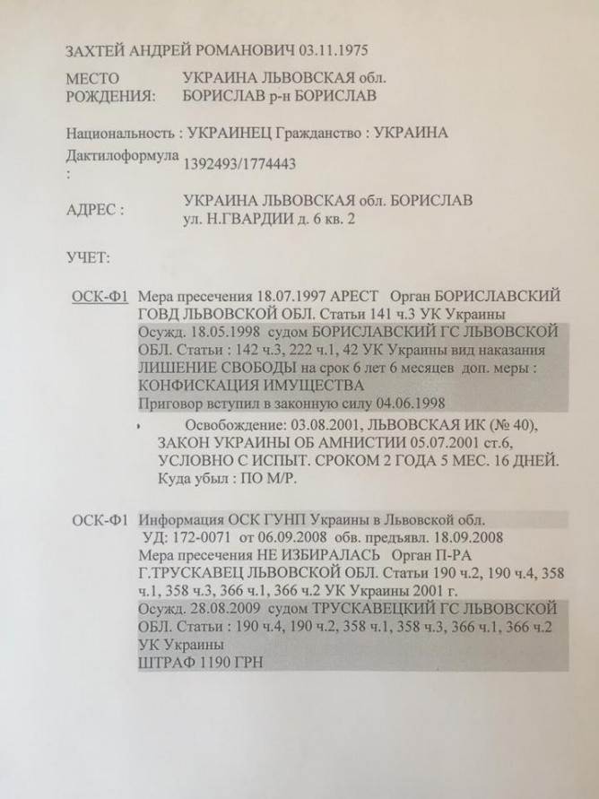 Геращенко также опубликовал фотографию Захтея и копию справки о его судимости.