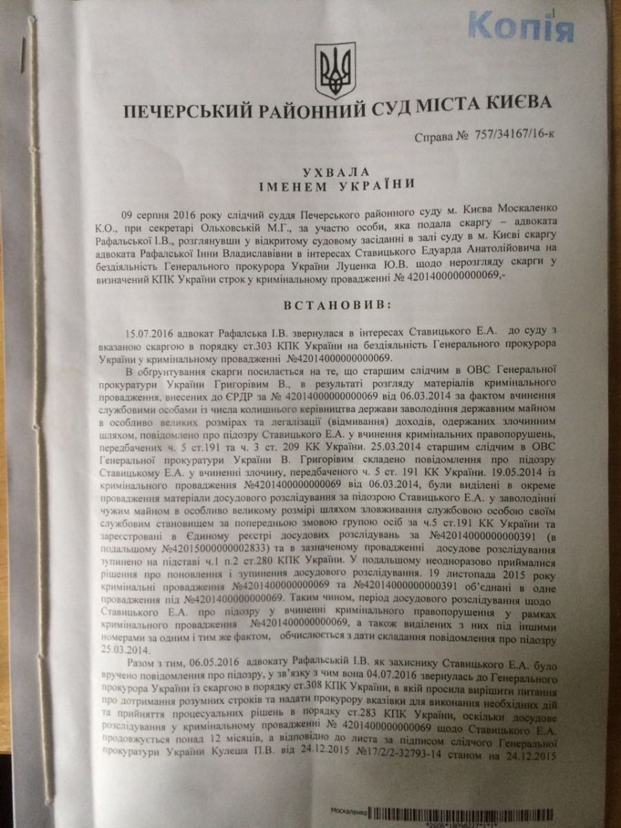 Экс-министр энергетики и угольной промышленности Украины Эдуард Ставицкий выиграл суд у Генерального прокурора Украины Юрия Луценко. Адвокат Ставицкого Инна Рафальская обнародовала соответствующее решение Печерского районного суда города Киева от 9 августа 2016 года, согласно которому установлена бездеятельность генерального прокурора в части рассмотрения жалобы адвоката Ставицкого о закрытии уголовного производства в связи с окончанием процессуальных сроков, установленных законом, сообщает Главное.ua.