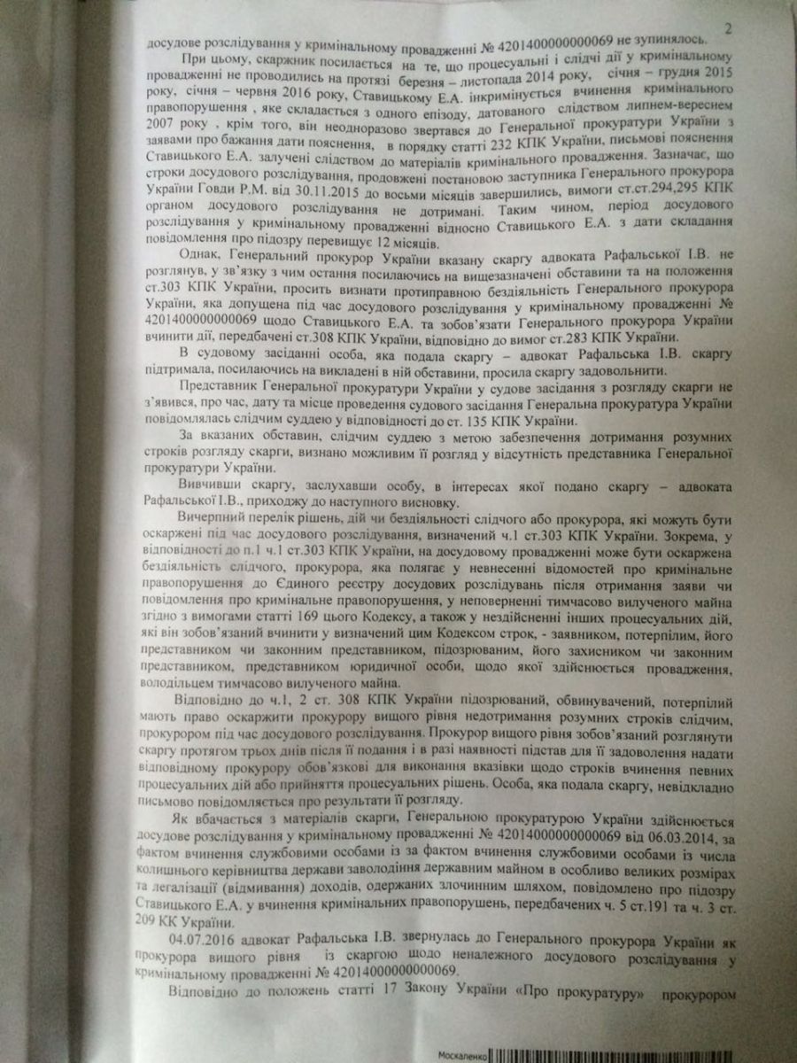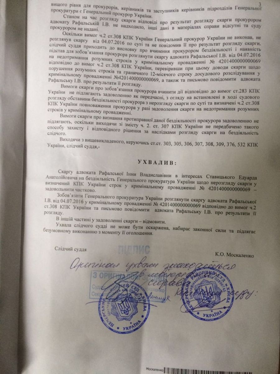 «Суд обязал Генпрокуратуру рассмотреть жалобу с учётом 12-месячного срока на право проведения процессуальных действий. Результатом исполнения данного решения указано либо удовлетворение жалобы адвоката, или же отказ в удовлетворении, что даст Ставицкому возможность обратиться в Европейский суд по правам человека (ЕСПЧ). Также, в случае неисполнения решения вообще защита имеет право обратиться с заявлением о возбуждении уголовного производства за неисполнение решения суда. При этом, любые следственные действия осуществлённые после вступления решения в силу (9 августа 2016 года) являются неприемлемыми», - сообщила адвокат Инна Рафальская.