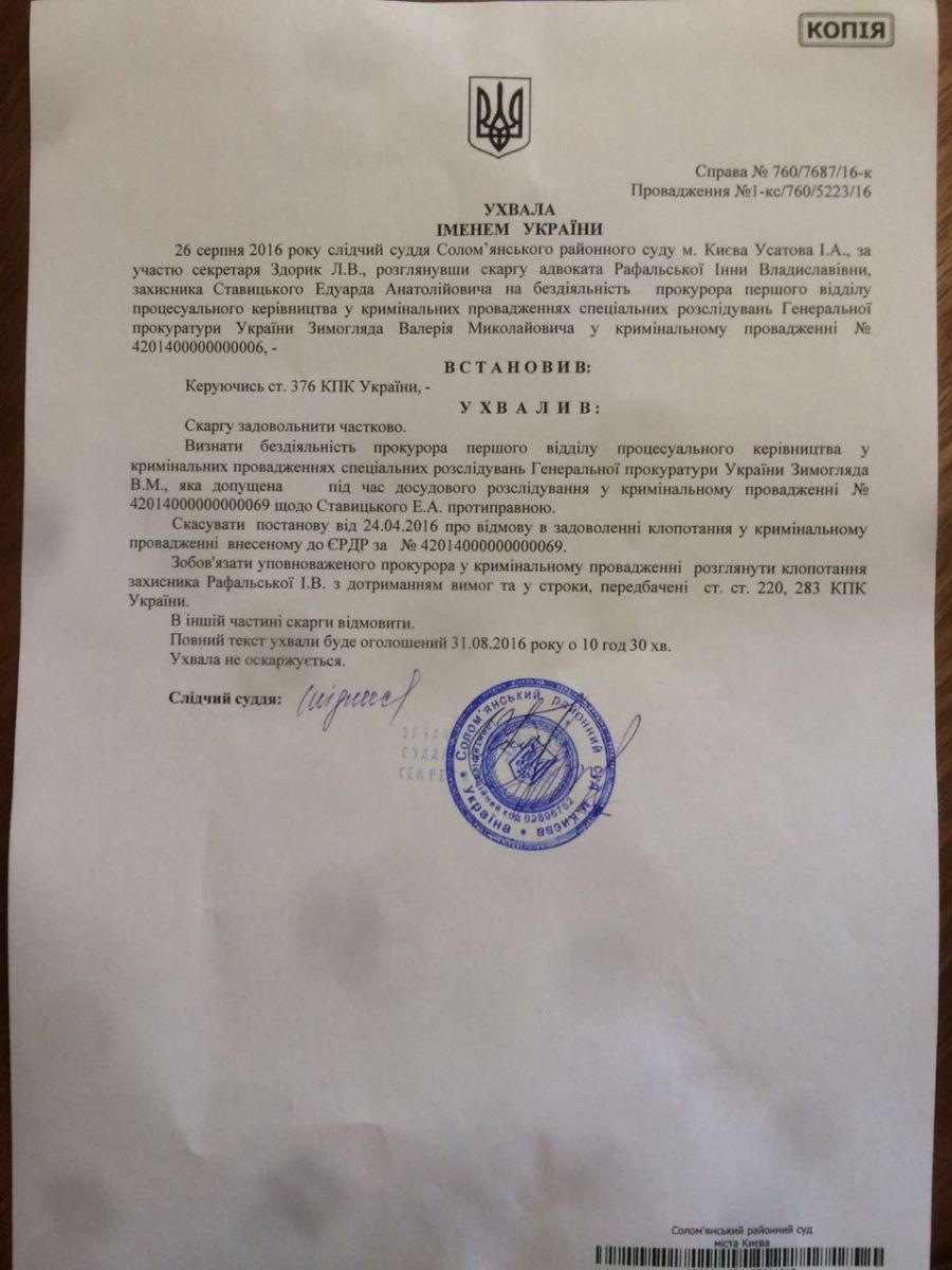 26 августа 2016 решением столичного Соломенского райсуда признано противоправным бездействие Генеральной прокуратуры Украины в деле рассмотрении доводов защиты в пользу бывшего министра энергетики и угольной промышленности Эдуарда Ставицкого. Об этом сообщила адвокат Ставицкого, Инна Рафальская, передает Glavnoe.ua.