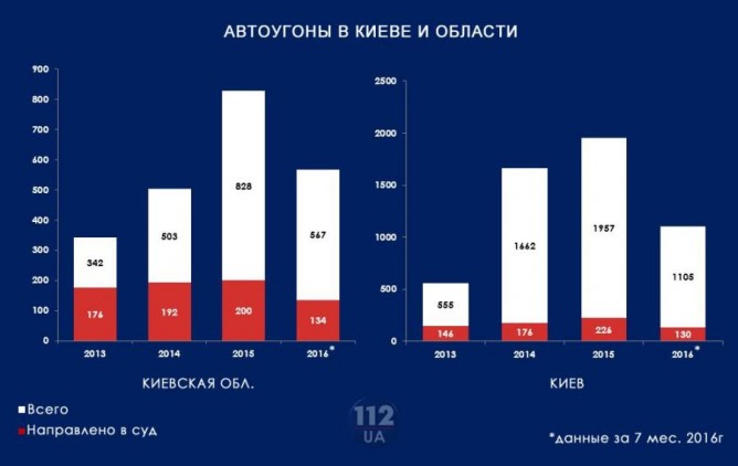 В Киеве в 2013 г. было открыто 555 уголовных производств по факту угонов, из них правоохранители раскрыли 146. В 2014 г. полиция зафиксировала 1662 угона, из которых раскрыла 176. В 2015 г. на территории столицы, по данным полиции, угнали 1957 машин, раскрыли 226 угонов. За 7 месяцев 2016 г. были угнаны 1105 авто, раскрыли 130 угонов.