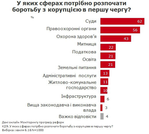 В первую очередь борьбу с коррупцией надо начать в судах — так считают 62% опрошенных. Затем в правоохранительных органах — 56%.