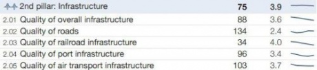 Согласно документу, Украина по критерию «инфраструктура» потеряла шесть позиций и заняла 75 место из 138 государств. Самый лучший результат показали железные дороги — 34 место, а самый худший — автодороги (134 место).