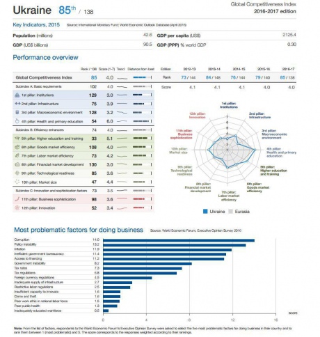 Так, по уровню развития финансовых рынков Украина занимает 130 место, по институциональному развитию — 129 место, макроэкономической ситуации — 128 место, эффективности рынка товаров — 108 место, уровню развития бизнеса — 98 место, инфраструктура — 75 место.