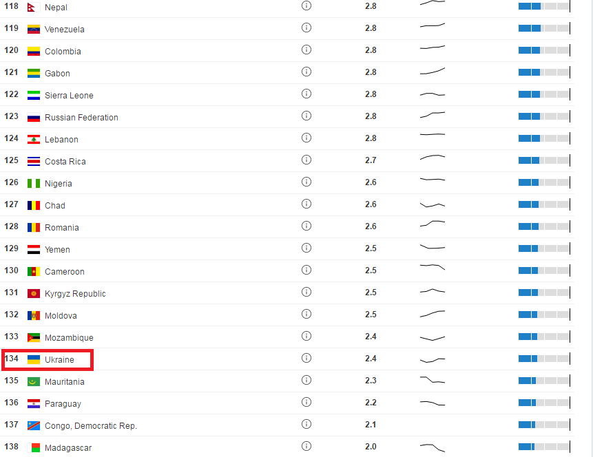 Украина заняла 134 место из 138 возможных в рейтинге качества автомобильных дорог, который составляет международная организация «Всемирный экономический форум». Рейтинг опубликован на сайте организации, передает Капитал со ссылкой на «112 Украина».