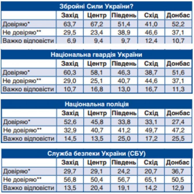 Наибольшую поддержку Нацгвардия получила на западе Украины: там ей доверяют 60,3% опрошенных, менее всего доверия проявили жители восточных регионов страны: там ей доверяют 38,7%.