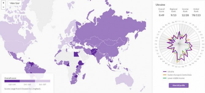 Украина заняла 78-е место в рейтинге верховенства права, составленном международной независимой организацией World Justice Project.
