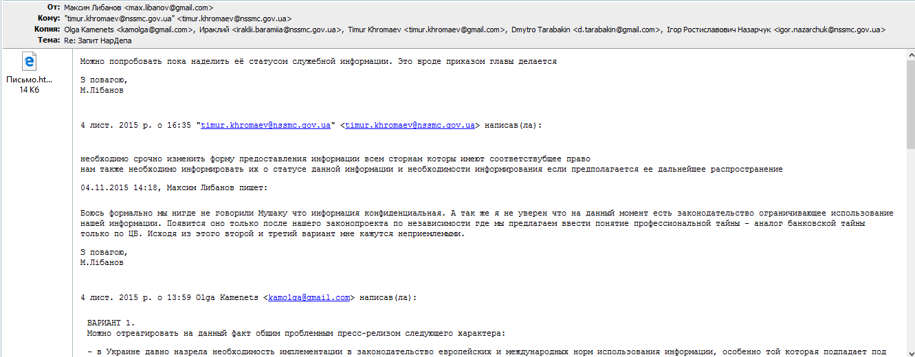 При этом советник Ольга Каменец предлагает заявить от имени Нацкомиссии, что они не передавали в СМИ конфиденциальную информацию и что депутат Мушак должен нести ответственность в рамках украинского законодательства. Чтобы отвести удар от Тимура Хромаева, Каменец предлагает «написать гневное письмо Мушаку, и на базе этого письма дать новость в СМИ». Мало того, что информация конфиденциальная, она, судя по тезисам Ольги Каменец еще и искаженная, и подводит к тому, что Нацкомиссия манипулирует информацией в своих интересах. В переписке она предлагает озвучить, что «данные вырванные из контекста могут привести к навязыванию конкретных выводов».