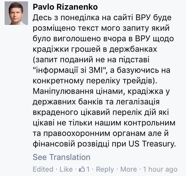 Так, народный депутат Павел Ризаненко на днях анонсировал на своей странице в Facebook запрос, в котором будут указаны операции трейдеров.