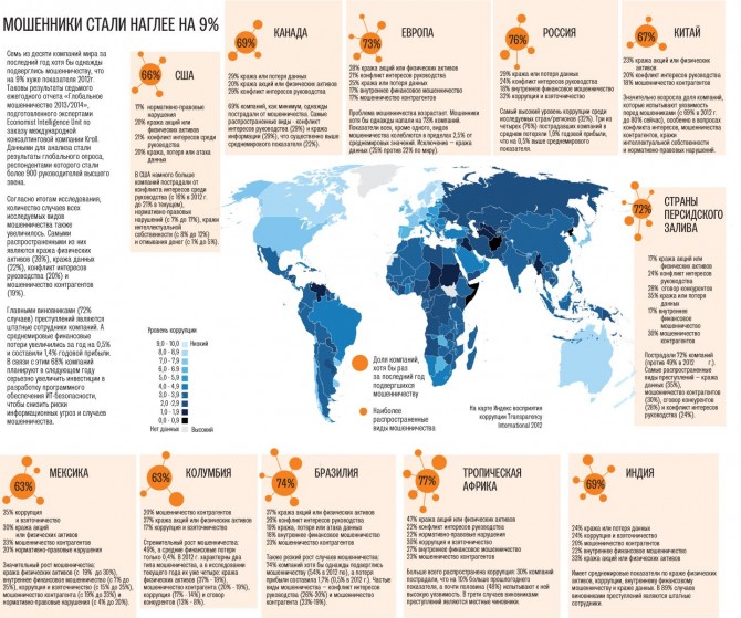 Таковы результаты седьмого ежегодного отчета «Глобальное мошенничество 2013/2014», подготовленного экспертами Economist Intelligence Unit по заказу международной консалтинговой компании Kroll, которая специализируется в сфере корпоративных исследований и управления рисками.