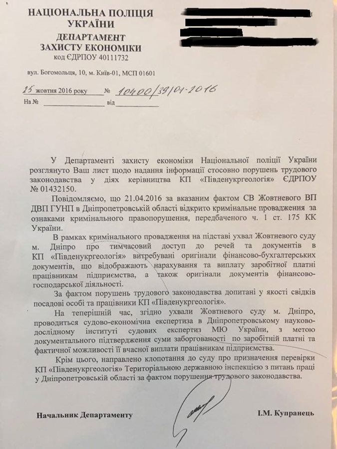 Также Жовтневим ВП ДВП ГУПН в Днепропетровской области осуществляется досудебное расследование в уголовном производстве №120160406500011716 от 21.04.2016 по признакам состава преступления, предусмотренного ч.1 ст.175 УК Украины. А это безосновательная невыплата заработной платы, содеянная преднамеренно.