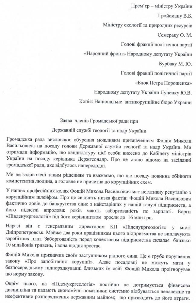 Еще в этом году Общественный совет при Государственной службе геологии и недр Украины в обращении премьер-министру Украины, министру экологии, главам фракций политических партий «Народный Форнт» и «Блок Петра Порошенко», а также Национального антикоррупционного бюро Украины указал на нарушения Николаем Фощием ст.9 Закона Украины «О противодействии и предотвращении коррупции», поскольку будучи руководителем государственного предприятия он назначил своим заместителем собственного сына. Это прямо запрещено законодательством Украины.