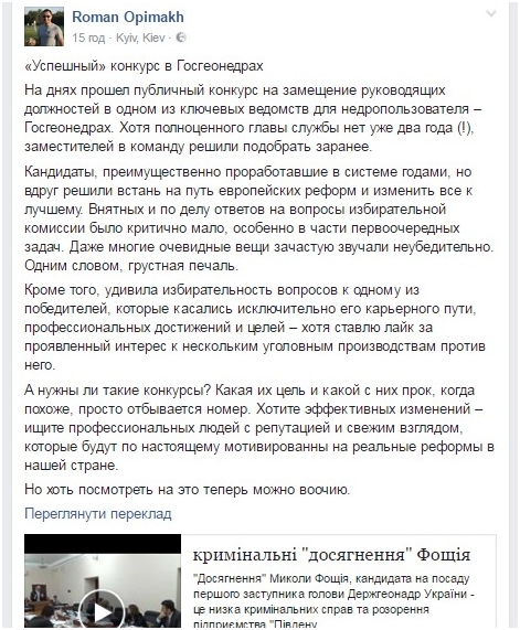 Не менее категоричен и исполнительный директор Ассоциации газодобывающих компаний Украины Роман Опимах, который раскритиковал конкурс на замещение руководящих должностей в Госгеонедра Украины на своей странице в сети Facebook.
