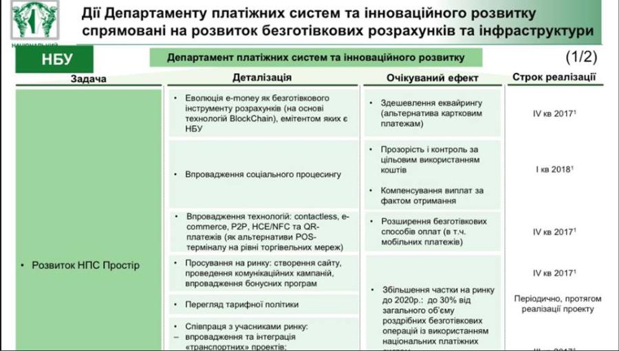Согласно презентации Департамента платежных систем и инновационного развития НБУ, в четвертом квартале 2017 года НБУ собирается стать эмитентом электронных денег на базе технологии Blockchain в рамках проекта НСП «Простір».