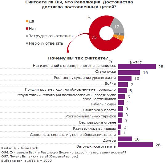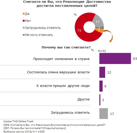 Спустя 3 года после начала Революции Достоинства большинство опрошенных считает, что она пока не достигла поставленных целей, такие данные опроса Kantar TNS Online Track. Противоположного мнения придерживается 5% респондентов.