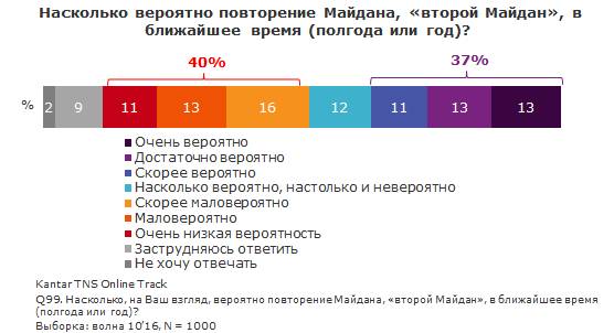 Касательно оценки вероятности повторения Майдана в ближайшее время, опрошенные украинцы разделились почти поровну: 37% опрошенных считают повторение второго Майдана вероятным, а 40% - маловероятным. При этом почти каждый 10 занимает нейтральную позицию (12%) и указывает на равные шансы обоих событий.