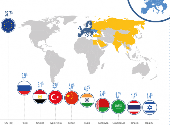 Основным торговым партнером Украины как отдельная страна остается Россия — 9,9% экспорта, но самая большая доля экспорта в ЕС (объединение стран) — 37,7%. На третьем месте Египет (6,1%), далее — Турция (5,9%), Китай (5,6%) и Индия (4,6%).