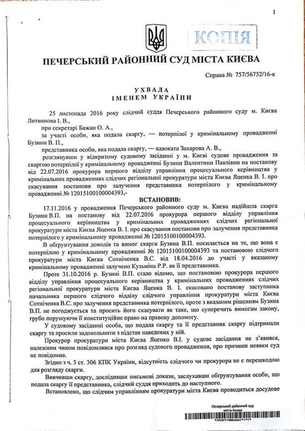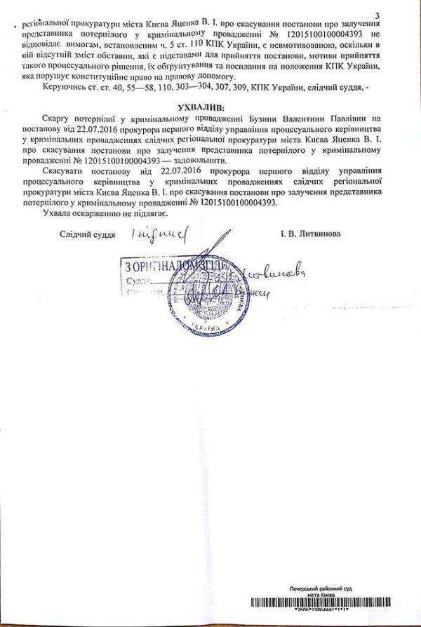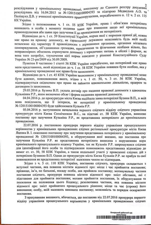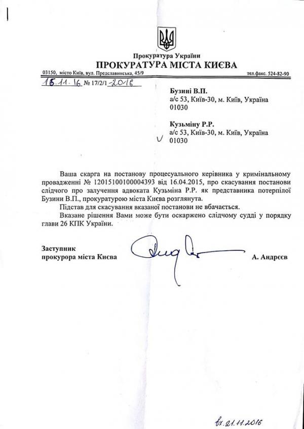 «Однако суд, рассмотрев мою жалобу, признал постановление прокурора об отстранении меня от дела Бузины незаконным, отменил его и вновь допустил меня к защите интересов потерпевшей», — отметил он.