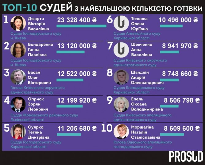 В целом каждый судья из списка ТОП-10 имеет более 8 млн гривен наличными.