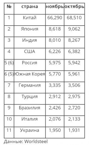Ближайший конкурент Украины, Италия, занимающая 10-е место, выплавила 2,07 млн т в ноябре 2016 г.