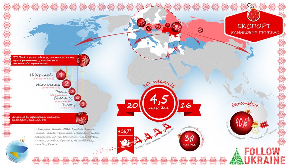 За 10 месяцев 2016 года Украина экспортировала елочных игрушек на 4,5 миллиона долларов в 25 стран мира, заявила заместитель министра экономического развития — торговый представитель Украины Наталья Микольская.