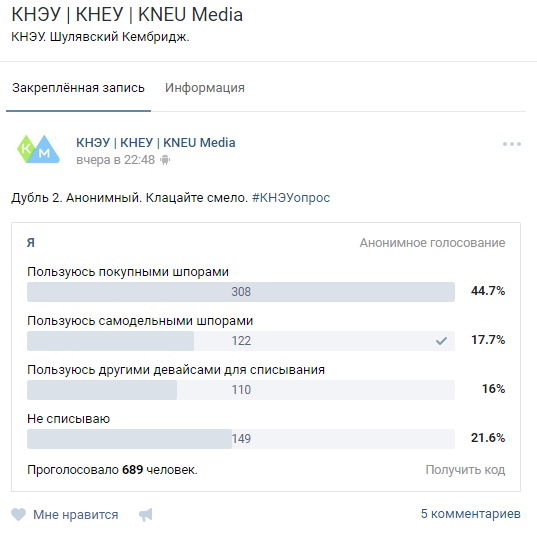 На анонимных голосованиях в соцсетях студенты КНЭУ имени Вадима Гетьмана признаются, что пользуются купленными шпаргалками.
