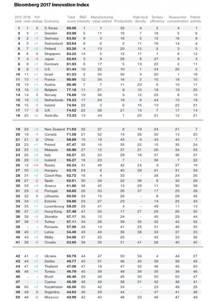 Южная Корея возглавляет рейтинг благодаря самой большой удельной величине расходов на научные исследования и разработки, патентной активности, производству с добавленной стоимостью и уровню высшего образования.