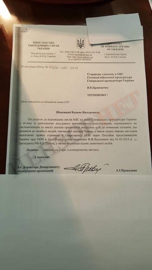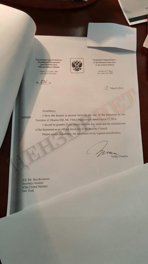 Напомним, на заседании Совета безопасности ООН 3 марта 2014 года постпред от России Виталий Чуркин продемонстрировал документ, который мог быть обращением Януковича к Путину с просьбой использовать вооруженные силы РФ в связи с событиями на Майдане.