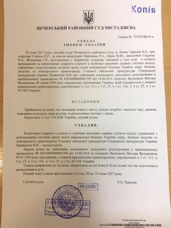 Печерский районный суд Киева разрешил Генеральной прокуратуре Украины проводить заочное досудебное расследование в отношении бывшего президента Украины Виктора Януковича, подозреваемого в государственной измене.
