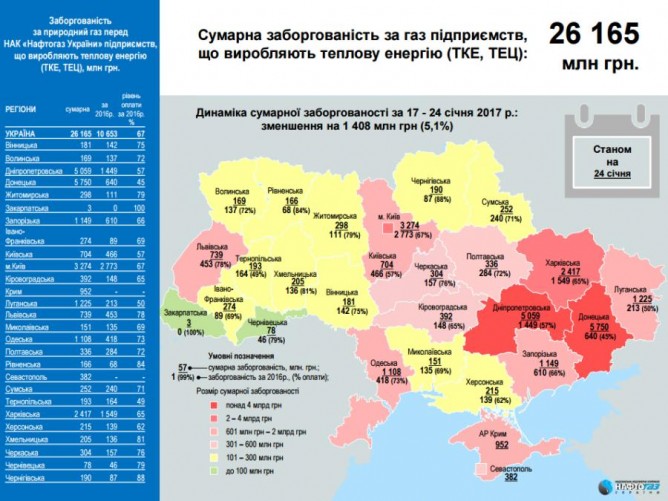 Как уточняется, по состоянию на 24 января 2017 года суммарная просроченная задолженность предприятий ТКЭ, ТЭЦ и прямых промышленных потребителей перед НАК «Нафтогаз Украины» составляет около 31,3 млрд гривен.