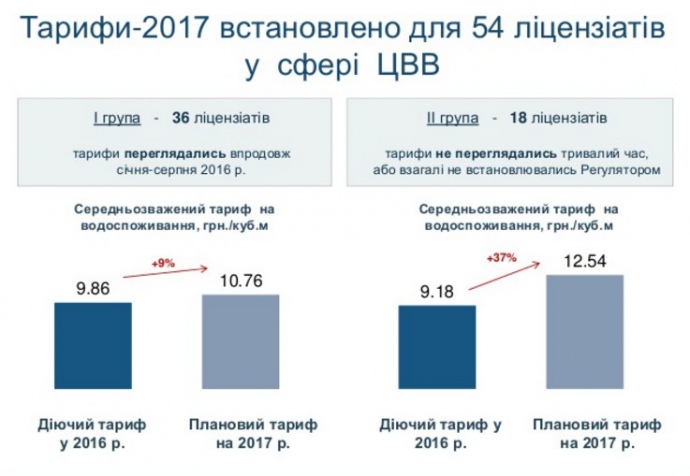 Так, для лицензиатов первой группы тарифы на услуги централизованного водоснабжения и водоотведения в 2017 вырастут на 9% — с 9,86 грн за кубометр до 10,76 грн за кубометр.
