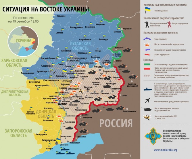 Напомним, что в меморандуме от 19 сентября 2014 года было сказаноо запрете на использование всех видов оружия и ведения наступательных действий. Вооружение калибром более 100 мм. должно было быть отведено от линии стыка на расстояние не менее 15 км с каждой стороны. Это должно было дать возможность создать зону прекращения применения оружия шириной не менее 30 км.