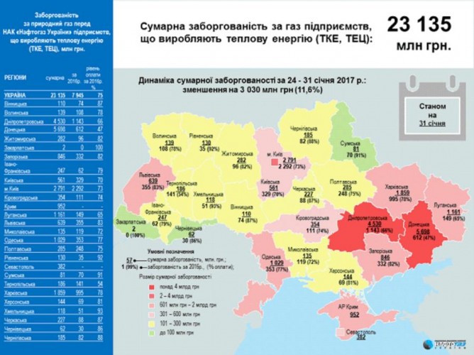 Как уточняется, по состоянию на 31 января 2017 года суммарная просроченная задолженность предприятий ТКЭ, ТЭЦ и прямых промышленных потребителей перед НАК «Нафтогаз Украины» составляет около 28,3 млрд гривен.