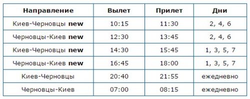 Дополнительные рейсы будут выполняться по смешанному расписанию: вылеты из Киева по понедельникам, средам, пятницам и воскресеньям в 14:30, вылеты из Черновцов в 16:45, вылеты из Киева по вторникам, четвергам и субботам в 10:15, вылеты из Черновцов в 12:30.