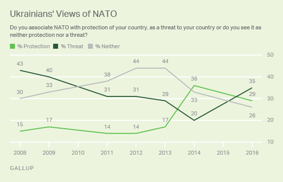 В 2014 году, после того, как НАТО наложил санкции на Россию в связи с аннексией Крыма, украинцы впервые были более склонны рассматривать НАТО в качестве защиты (36%), чем угрозы (20%). Тем не менее, процент скептиков вырос до 35% в 2016 году, поскольку украинское население устало от продолжающегося конфликта на Донбассе, проблем в экономике и высокого уровня преступности.