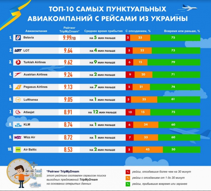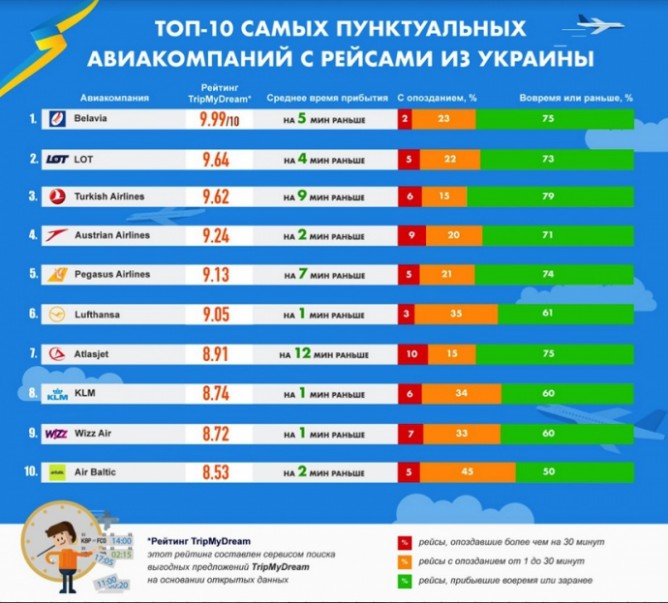 Кроме Belavia, LOT и TurkishAirlines, в список самых пунктуальных авикомпаний, у которых есть рейсы из украинских аэропортов, попали AustrianAirlines, PegasusAirlines, Lusthansa, Atlasjet, KLM, WizzAir и AirBaltic.