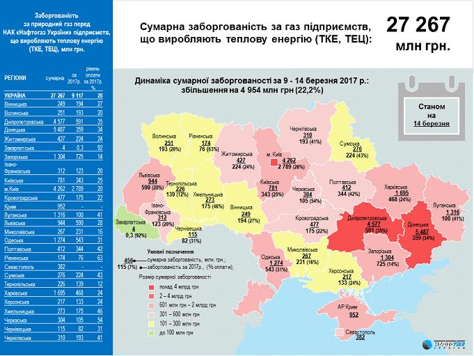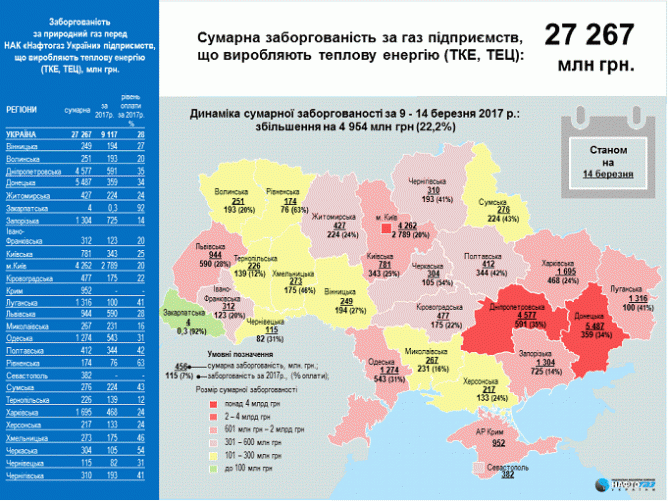 Задолженность предприятий ТКЭ и ТЭЦ за неделю увеличилась на 4,954 млрд гривен (22,2%).