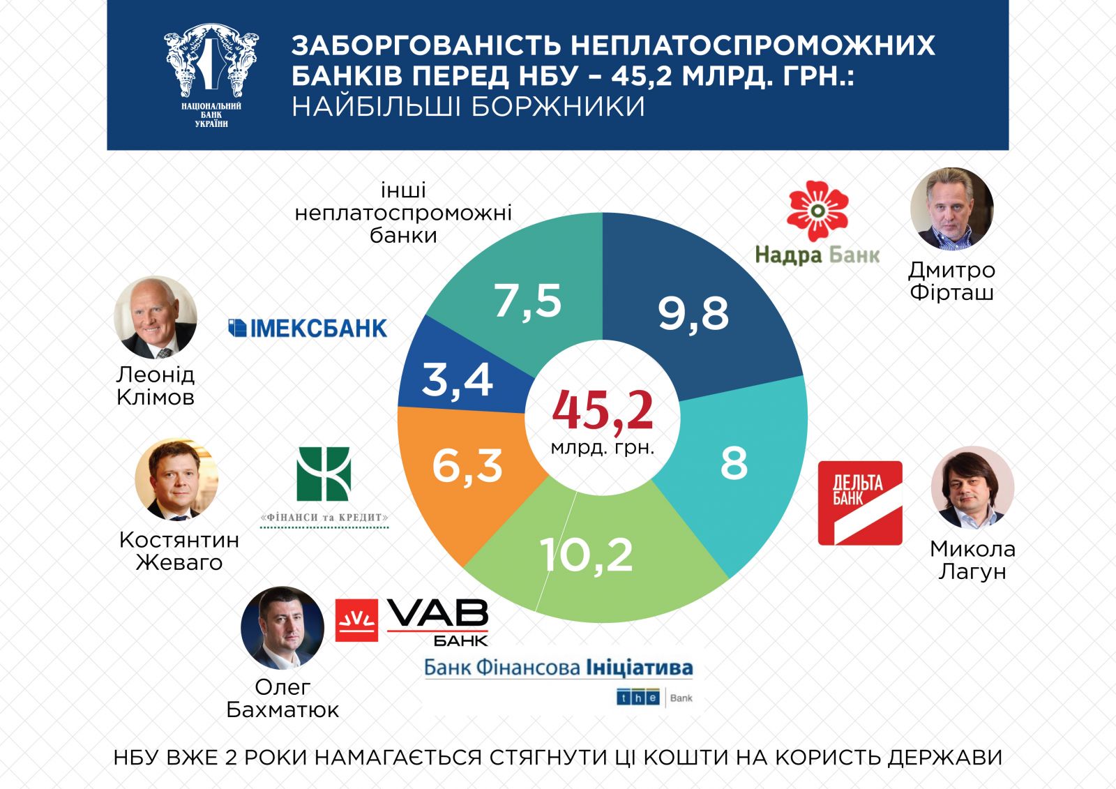 Самые значительные суммы долгов приходятся на банк «Надра» Дмитрия Фирташа (9,8 млрд грн), Дельта Банк Николая Лагуна (8 млрд грн), «Финансовая инициатива» (7,2 млрд грн) и ВиЭйБи Банк (3 млрд грн) Олега Бахматюка, банк «Финансы и Кредит» Константина Жеваго (6,3 млрд грн), Имэксбанк Леонида Климова (3,4 млрд грн).