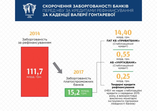 «С начала 2017 года общий объем задолженности платежеспособных банков перед Нацбанком по кредитам рефинансирования сократился на 7,7 млрд грн, или на 34%. К 5 апреля этот показатель составлял 15,2 млрд грн», — уточнили в пресс-службе НБУ.
