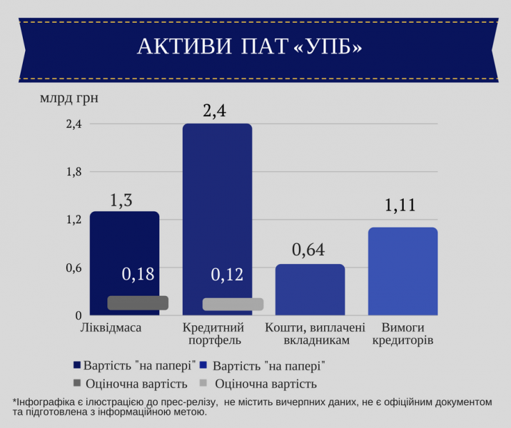Тотальная проверка документации и операций банка показала, что из него были выведены все активы, вплоть до недвижимости и офисной техники. Общая стоимость этих активов составила ориентировочно 348 млн гривен. Как и в остальных случаях, продажа внеоборотных активов была осуществлена без фактического поступления средств на корреспондентский счет или наличных в кассу банка.